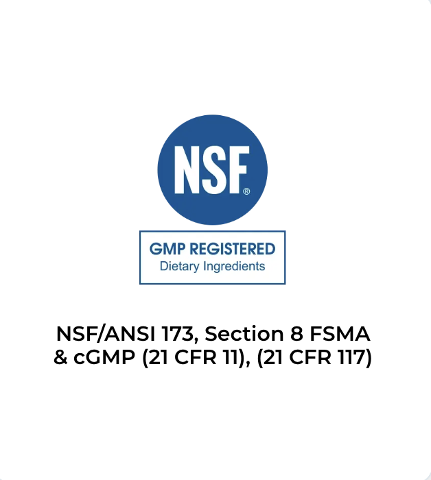 Our supply chain is aligned with internationally recognized regulatory and quality standards, including FDA-registered facilities, cGMP compliance, and globally accepted food safety frameworks.