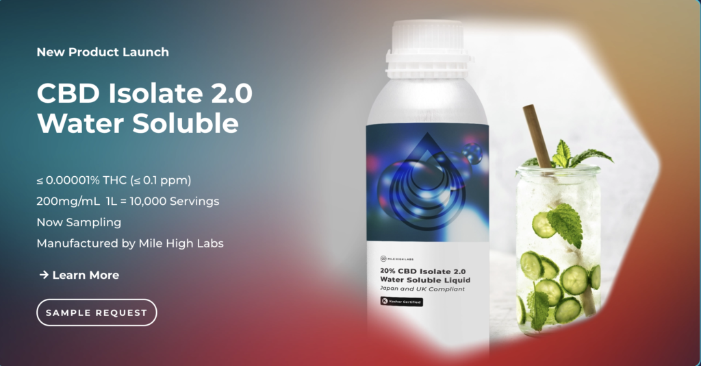 Mile High Labs 20% CBD Isolate 2.0 Water Soluble Liquid is a micro-emulsion liquid concentrate that is dispersible in almost any beverage or liquid food. Formulated with pure CBD Isolate 2.0, our water soluble CBDโs ease of use, long shelf-life stability and minimal impact on flavor and mouthfeel make it the ideal CBD beverage solution.